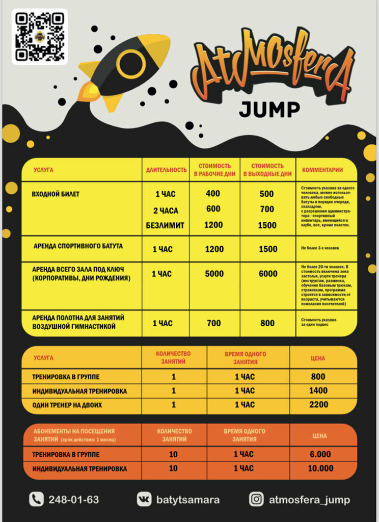 Стоимость указана за одного человека, можно использовать любые свободные батуты в порядке очереди, скалодром, с разрешения администратора - спортивный инвентарь, имеющийся в клубе (кроме полотен).