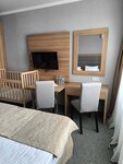 Добрый день, хочу поблагодарить за отдых! Очень вкусно кормят, еда как домашняя, сытная, шведский стол (овощи, фрукты, салатики, первое, второе, сладости, компоты , морсы, йогурты, утром кофе, молоко. Дочь даже спрашивала почему так вкусно кормят 😄 Спасибо персоналу в обеденной зоне, все доброжелательные и с улыбкой на лице. Территория очень красивая, ухожено, растения разнообразные, пруд с рыбками, детские площадки, качели. Бассейны (3шт) все это замечательно. Дети в восторге. Так же тут не дают скучать аниматоры. Море чистое, пляж большой. Заселили нас раньше на час, чем должны, сразу покормили. Для нас минусом оказался подъезд к отелю (ну уж очень узкие улочки и мест парковочных нет). Пришлось встать наполовину проезжей части, выгрузить сумки. Это может не так критично, но неудобно. Стоянка платная имеется, но от нее далеко, если нести все сумки. В номере нам сразу поставили детскую кроватку, все было застелено, полотенца выданы. Так же положили щетки с пастой на каждого члена семьи, гели, шампуни и мыло выдавались. Проблем с кулером не было, по каждой просьбе сразу несли воду или заменяли полотенца, постель. Спасибо 🙏 Утюг, фен, чайник, микроволновка, телевизор, кондиционер есть. Так же имеется балкончик с сушилкой, столиком и стульями. Убирались каждый день, но ковролин грязный. Думаю в отелях нужно все таки делать моющиеся покрытия полов. Тем более в семейных (дети ползают). Ставлю 4звезды)