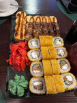 Из плюсов: роллы быстро сделали, есть промокоды на скидки, разные подарки к заказу от определённой суммы, сам ресторан приятный ( хотя для нас это было неактуально, потому что брали навынос) В остальном.... Роллы, если брать среднее по больнице, действительно достаточно большие, но только засчет совершенно невкусного сливочного сыра внутри. Было пару (притянуто за уши) неплохих позиций, но в остальном никакого удовольствия, послевкусие странное и доедать не захотелось.