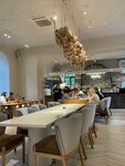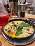 По еде все очень вкусно!👍хотя по началу смущает такой разброс от пасты и пиццы до Том Яма.Брали и салаты и горячее, всем все очень понравилось. Очень вкусные домашние лимонады, как положено с газом. Интерьер светлый,минималистичный, приятная музыка и официанты. Есть небольшая детская комната. Звезду сняла только за долгое ожидание напитков. 20 минут это очень долго, несмотря на полную посадку.Так же был не очень чистый туалет и отсутствие мыла на общей раковине. Но плюсов больше чем минусов👍