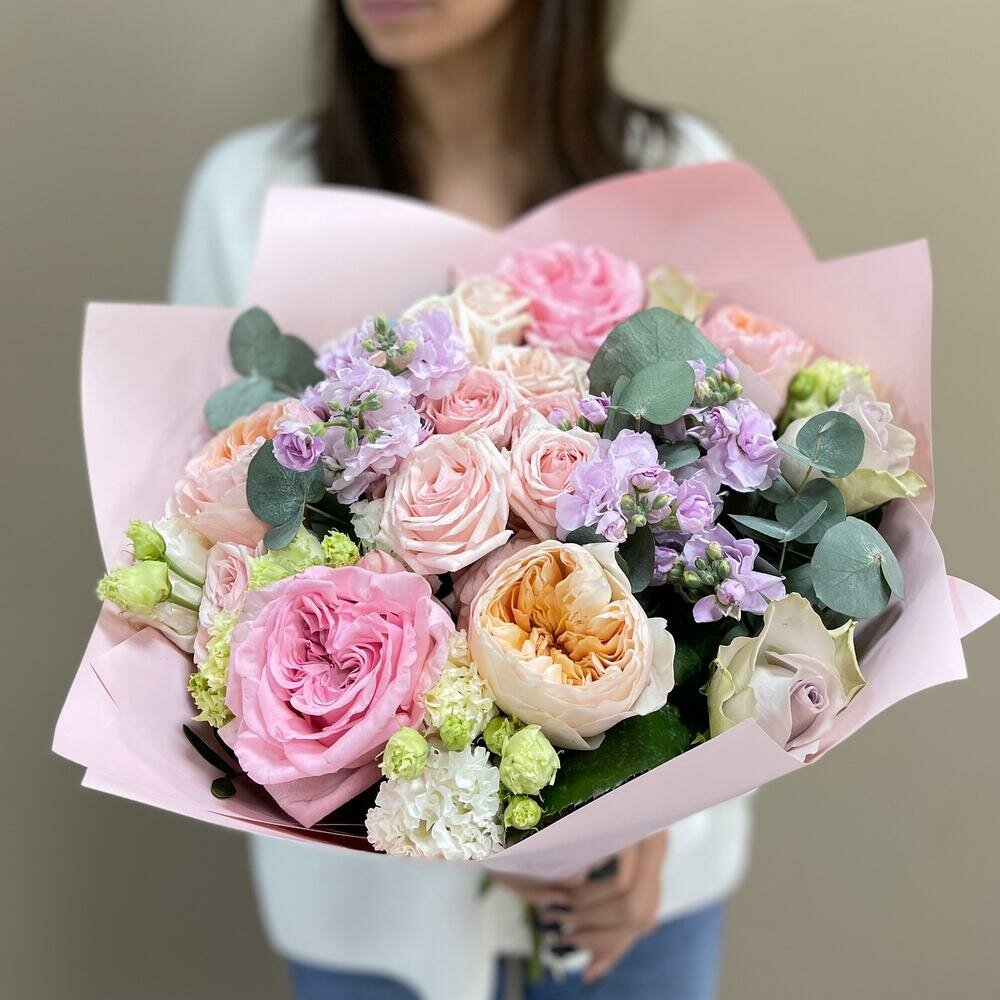 Стильное сочетание ароматных лавандовых роз и эффектного эвкалипта