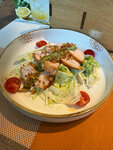 Погрузитесь в мир вкусов с нашим изысканным салатом, где нежная курица гармонично сочетается с пикантными анчоусами и лёгкой горчинкой горчицы. Хрустящие гренки, свежий салат айсберг, сладкий вкус томатов черри и насыщенный аромат сыра пармезан созда