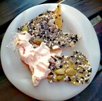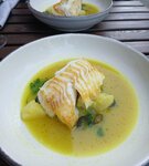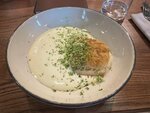 Не так я себе представляла «треску с брокколи и муссом из камамбера». Планировала поужинать рыбой с овощным гарниром, а принесли рыбу залитую белым соусом и посыпанной парой щепоток натертой на мелкой терке капусты. С учетом того, что предыдущим пунктом в меню значатся котлетки с пюре, такого подвоха просто не ожидала. До этого заказывала равиолони, тоже принесли один пельмень залитый примерно такой же белой жижей (тут скорее вопрос вкусовщины, поэтому просто с моей точки зрения брать не советую), но он хотя бы был, в отличие от брокколи в блюдо с треской. Окрошка на квасе отличная, за нее в итоге ставлю заведению две звезды, а не одну.