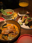 📍Juan Cantina Espanola - яркий испанский ресторан 🇪🇸 Первое знакомство с испанской кухней, и сразу - любовь. Внимательные официанты, невероятный декор и вкусные блюда покорили с первой секунды. Интерьер выше всех похвал: лампы с теплым светом, витражи, королевские уборные, барные стойки, необычные букеты, яркая посуда, овощи, фрукты, бокалы и бутылки - все выглядит гармонично и невероятно стильно. Хочется рассматривать кааааждый уголок, будто музей современного искусства, только гастрономический🥹 Столики расположены вокруг барной стойки. Ресторан находится в закрытом дворике, а снаружи - еще одна барная стойка и веранда, уже в более легком и летнем стиле. Нам удалось пообедать внутри за столом и угоститься десертами на улице за барной стойкой. Оба варианта - выше всяких похвал! ✨Must try: •паэлья с морепродуктами - моя первая, и это восторг! Морепродукты сочные, соус насыщенный. Порция не огромная, можно осилить и одному •тако с креветками, гуакамоле и томатной сальсой - легкая острота идеально подчеркивает вкус •брауни с соленой карамелью и халапеньо - вау вау вау💔 неожиданное сочетание, которое оказалось просто космос. Шоколад, карамель и остринка… я в раю •картофельные чипсы с хамоном - сами чипсы обычные, но хамон потрясающий, пробовала впервые 📌 Плюсик за разнообразное меню безалкогольных коктейлей 💆‍♀️ Даже при полной посадке внутри тихо и спокойно - редкость для такого яркого места. 🪴 Интерьер: 1000/5 🌟 Сервис: 5/5 🥘 Еда: 5/5 🍽️ Порции: 5/5 💭Вернулась бы? Да, и обязательно! Я под огромным впечатлением 🌿Больше гастро-историй в моем фотоблоге @thediary.li