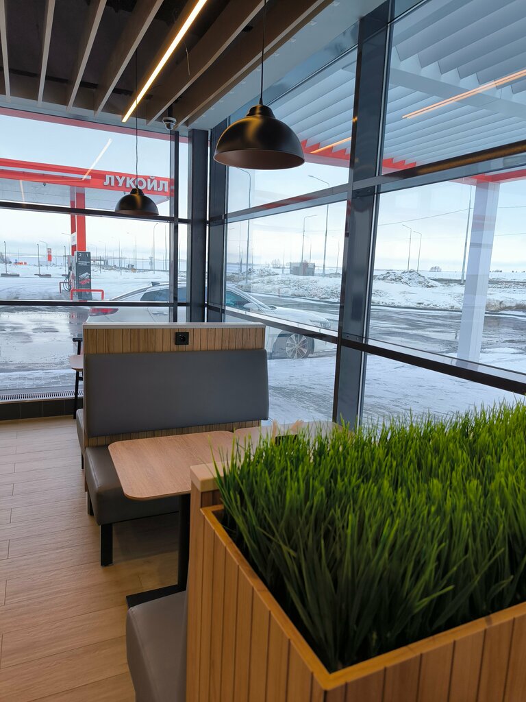 Большая, комфортная заправка Лукойл на М-12. Удобный заезд и выезд, чистые туалеты, душевный персонал, большой выбор еды и напитков, столики с мягкими диванами. Прекрасное место для отдыха во время длительного пути. А сейчас ещё и новогодняя атмосфера - установлена большая нарядная елочка.