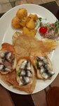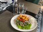 Салат из хрустящих баклажан ну неплохо если бы не залили острым соусом. Дальше был треш. Принесли котлетки из тунца. Я сразу спросила почему подгорелые? Ответили это не подгорелые. Овощная подушка выглядела тоже не очень презентабельно... Все овощи были какие-то темные, возможно из-за соевого соуса, но все это было не очень аппетитно. Когда разрезала котлету- она конкретно воняла испорченным продуктом😡. Забрали. Перезаказала на филе тунца. Принесли какой-то тонкий кусок. Ну ок. Но он был весь пересолен!! Есть невозможно! Картофель ро домашнему не испортили.. Конечно всё оплатила и конечно весь вечер мучалась от несварения. Я остановилась в Калининграде в ХолидейИнн , ток вот в кафе при этом отеле готовят гораздо и гораздо вкуснее! А эта «монополия»-Ужасно. Крайне не рекомендую!