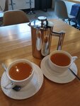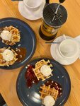 Небольшое заведение, достаточно уютное, не многолюдное. Мягкие удобные диваны с подушками. Есть возможность зарядить гаджеты. Меню небольшое, но все необходимое для завтрака, обеда или ужина есть! Цены средние. Ждали блюда минут 20. В салате Цезарь мне не зашла сметанно-майонезная заправка (слишком ощущается майонез )и сухарики (они безвкусные). Тыквенный суп хорош. Сухарики нет 😀 В бульон для куриного супа с лапшой по ощущениям добавили соевый соус. Будьте готовы, что по вкусу он будет отличаться от классики. Вкусный облепиховый чай с мёдом. Вернуться сюда можно, чтобы попробовать еще вафли и роллы.