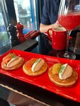 Вот и пришла очередь второй главной легенды Большой Никитской - вслед за посещением "Уголька" направил себя, так сказать, в соседнюю дверь. В очень красивый, вне времени стильный ресторан Ильи Тютенкова "Северяне". Небольшое помещение, плотная рассадка, расслабленный вайб утра выходного дня. Посадка на 9-50 утра в зоне "столики у распашных окон" - уже плотненькая. Веранда доступна, но жара загоняет всех внутрь. Сервис внимательный, вежливый, оперативный. Да дайте уже поесть что-нибудь, прошу! Хлеб с маслом (комплемент) - кухня сразу заходит с козырей. Хлеб - свежий и вкусный, масло - копчёное (?), ароматы и вкусы дополняют друг друга, хочется сразу все смолотить и убежать радоваться жизни. И этому хлебу! Оладьи с икрой и лососем 1250р - три идеальных по форме и по вкусу оладушка. На каждом по шмяку плотной и жирной сметаны. Один - с красной рыбой, второй с красной икрой, третий - с икрой щучьей. Праздник жизни настоящий. Все ингредиенты такие свежие и вкусные, что оладьи пропадают как дрова в печи. Всерьез будете думать, не заказать ли вторую порцию - невероятно вкусно. Хот-дог с пастрами 990р - эстетичный и красивый хот-дог на красивой узкой тарелке. Замечательные огурцы. Лидирующий соус - острая шрирача. Очередной карнавал вкусов и счастья. Пастрами наивкуснейший. Сытно, остро, многогранно. И на завтрак тоже просто замечательно. Оладушек с клубникой 550р - идеальный оладушек из абзаца выше, который лежит на шапке из клубники и, то ли сметанного, то ли сливочного соуса (забыл уточнить его природу). Тут своя гастрономическая механика - начинаешь оладушек пилить ножом и все естество снизу поднимается, обнимая главного героя всеми своими вкусами. Клубника прекрасная, соус тоже. Очень вкусно. Творожное кольцо 490р - обыкновенное творожное колечко, да есть нюанс. Во-первых, оно глазурированно и сверху слегка опалено (как же это вкусно). Во-вторых, рядом, как будто запасная порция обычного творога, но нет, он немного взбит, как будто с вареной сгущенкой. Ну тут пришлось вызывать гастрономическую полицию. Так вкусно, что незаконно. Только ради этого, вдумайтесь, творожного кольца, нужно обязательно посетить ресторан. Напиток арбуз/юдзу 500р - бокальчик натуральных, негазированных, смешанных соков; освежить рецепторы просто замечательно. Капучино (450/0.3) - вы удивитесь, если я скажу, что кофе идеален? Не удивляйтесь. Кофе идеален. Итог: тут можно быть кратким - одни из лучших завтраков во всем городе. А может быть, и лучшие. Обязательно вернусь и на основное меню тоже, про завтраки даже не спрашивайте. Считаю дни до своего следующего творожного кольца! Безоговорочно 5 баллов.