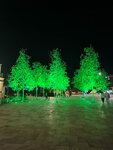 Фонтан большой и красивый, работает с "музыкальным видео-сопровождением" по выходным. Видео-сопровождение на воду запускают через одну песню, а не постоянно. Вокруг площади деревья красиво подсвечены зеленым цветом, качели желтым, стена крепости видна - красота! По будням там легкая музыка и фонтан без шоу.