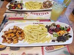 Кафешка расположилась прямо на центральной улице Ататюрка рядом с Вайкики. Изначально нас привлекла относительно небольшая цена за порции. Еду распробовали, оказалось вкусно и очень сытно, в итоге ходили за курочкой несколько раз. Заведение пользуется спросом, поэтому в часы-пик придётся немного подождать. Первым делом приносят водичку, но, как и писали ниже, если ей воспользоваться, она будет включен в счёт (на октябрь 2023 стоимость была 10 TL). Затем приносят закуски. Очень рекомендую попробовать картофельные шарики с сыром внутри. Через какое-то время приносит большую тарелку с курочкой (можно выбрать 1 из 20 способов приготовления) или мясными котлетками, макароны - песто/томатные или картофель фри, а так же салат. Если заказываете острое блюдо, будьте готовы, что оно будет очень, очень острым, нужен напиток! Блюда сытные, можно в качестве альтернативы заказать салат Цезарь. Для детишек есть детское меню с морковкой.