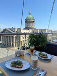 Замечательный ресторан! Позвонили за 20 минут до визита уточнить, сможем ли мы сесть. Нам сказали, что можем подходить, места будут. Смогли выбрать удобное место на террасе с потрясающим видом. Ограничение по времени - 1,5 часа, но этого вполне достаточно для завтрака или обеда. Мы были на завтраке. В выходные ресторан работает с 12:00, и завтраки подают только до 13:00. Может было бы лучше, если их подавали хотя бы до 14:00. Персонал вежливый, еда - вкусная. Остались с подругой в полном восторге от вида на Казанский собор. Теперь данный ресторан всегда будет обязательным для посещения во время визита в Петербург!