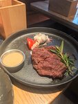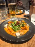 Забронировала столик накануне через тг чат бот @TheBullMskbot, всё интуитивно понятно и получилось с первого раза. Пришли к забронированному времени, нас сразу проводили за столик, официант оперативно принял заказ. Мы с подругой попросили передать, чтобы немного стейки Блейд (550 руб) пожарили подольше, так как не очень любим когда с кровью внутри, и нам принесли well done стейки. Ооочень вкусные 😋, я давно не ела в чистом виде просто вкусное мясо, с перечным соусом. Салат с запечённый тыквой 400 руб, фри батат 400 руб и яблочный сидр 0.5 л -390 руб-все также вкусно и красивая подача. Официант Иван Голышев 💪 ненавязчиво, быстро, качественно курировал наш столик, что также создало прекрасное ощущение атмосферы вечера. Терпеливо объяснил как оплатить через qr код, если мы хотим разделить чеки, через их приложение. Все также удобно 👍, современно, порадовала технологичность и продвинутость платежной системы. Остались приятные эмоции от посещения The Бык на Новослободской 16.