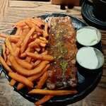 Стейк из диафрагмы с выраженными волокнами и насыщенным мясным вкусом. Томат, жареная кукуруза, специи