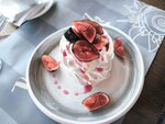 Место хорошее, вид, обстановка. Оригинальное меню было, фестиваль инжира. Взяли пиццу и десерт с инжиром. Пицца вкусная, из печи. Десерт Анна Павлова, у нас само безе помягче делают, здесь прямо сухое. Мидии вкусные, мягкие, очень довольны. Кафе дорогое. Обслуживание немного долгое, это с учетом, что мы были утром и загрузка была 4-5 столов. Вечером тут аншлаг, не знаю сколько ждать, но видели люди подолгу сидят. Вообщем неплохо. Никаких скидок или комплиментов на день рождения нет. У нас (в г. Ростове-на-Дону) трудно найти заведение, где не делают скидку на день рождения. А во многих еще десерт именнинику выносят.
