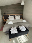 Отдыхали в Верес Отеле в выходные. Были в гостинице, в номере люкс. Очень понравился номер, кровать широкая и удобная. Дочка спала на раскладном диване, он тоже достаточно широкий. Я бы столик на балкон добавила, что бы удобно было чай пить. Окна выходили на шикарный лес и озеро. Очень вкусные завтраки и большой бассейн. Для нас было плюсом, что вход в бассейн прямо из гостинницы и не надо выходить на улицу. Отличная детская комната с мастр классами и аниматором Екатериной. Дочка в восторге! Очень приятные девочки на ресепшине и ответственный администратор. Сложилось впечатление, что нас очень ждали и нам очень рады! Очень красивый лес вокруг и озера. Единственное, очень хочется отдельной пляжной зоны для отдыхающих в отеле и шезлонгов очень нехватало. Побольше бы ещё скамеечек в лесу, что бы насладиться природой. Спасибо за отличный отдых! Приедем к Вам ещё!