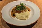 Лепешка с деревенским цыпленком, вешанками и трюфельным соусом