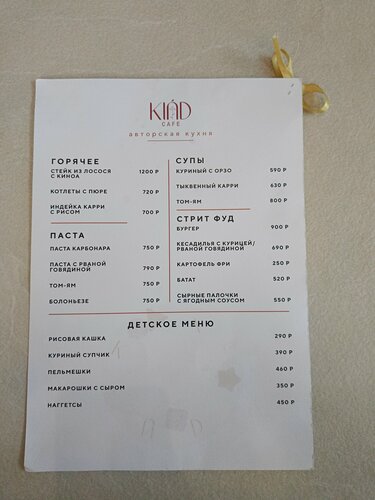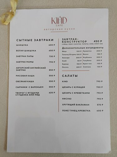 03.2026 Кафе закрылось. 21.01.2026 Снимаю 1 звезду. Меню сильно сократили. Салат из баклажанов без восторга, не хватило изюминки соуса. Карбонара тоже была довольно обычная, соус брызгается, а не тягучий. Картошку фри испортить сложно, поэтому она была норм. Стало как-то грустнее в кафе. 30.05.2025 Всегда вкусно. И завтраки, и обеды, и ужины. Часто приходим большой компанией с детьми. Игровая очень выручает и больших, и маленьких. Официант Ксения - просто душа заведения, всегда всё быстро, четко и при этом заботливо. Из небольших минусов - внушительный пробковый сбор, но это детали. Из любимых блюд - кесадилья с курицей и овощами, удон с умопомрачительным соусом. Дочь на завтрак любит шоколадно-банановые вафли с вишней и мороженым. Все блюда с рваной говядиной - пальчики оближешь😉 В 9 из 10 случаев для приятной встречи, начала или окончания дня выбираем Kind) наше кафе для добрых встреч❤️