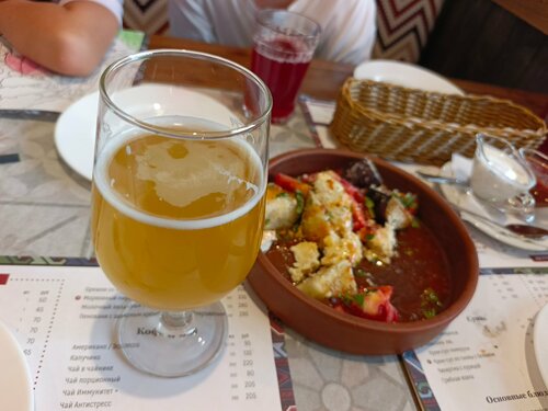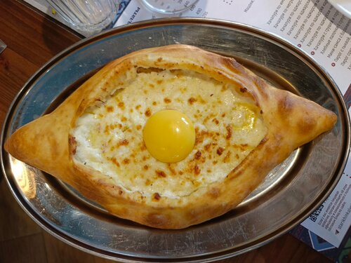 Хороший небольшой ресторанчик. В выходной день без брони лучше не рисковать, посадочных мест нет. Можно понять: вполне бюджетный ценник на вкусную и сытную еду. Меню небольшое, но есть все и салаты и выпечка и конечно же хинкали. С говядиной, свиной-говядиной, бараниной с зеленью, три сыра, с вишней. Соки, морсы, узвар из сухофруктов. Из алкоголя три вида пива. Но! Вы можете прийти со своей бутылочкой вина, оплатить "пробковый сбор" 350руб. и наслаждаться своим вином и прекрасной едой. Все пробовали, особенно зашёл салать из хрустящих баклажанов- баклажаны само собой вкусные, но мне кажется что помидоры и соус еще вкуснее. Не поняла что за сыр в салате, такой крупинчатый, но вкусно. Хачапури по-аджарски, наверное, самый популярный и не раз съеденный любым человеком, но тут даже само тесто очень вкусное! Небольшой минус: у меня начинка из баранины из хинкали при поднятии за хвостик вывалилась на блюдо вместе с бульоном и обрызгала одежду, неприятно. Видимо тонковатое тесто сделали. Но отдать должное, мне заменили тарелку и бесплатно принесли на замену новый хинкали. Хотя к этому времени уже и без него наелись до отвала 🤣. Все что не съели без нашей просьбы упаковали нам в контейнеры с собой👍👍👍 В общем хороший ресторанчик как посидеть долго и основательно, так и перекусить на бегу.