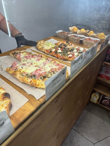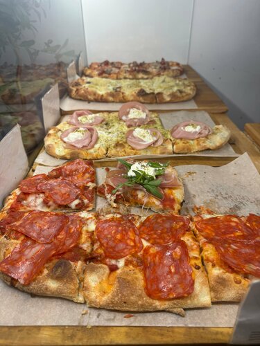 Порекомендовала подруга, оказались харизматичные ребята, неожиданный ассортимент пицц, можно взять кусками, можно на вынос! Капричозза оказалось достойной, дома с вустерским соусом и бальзамиком волшебно зашла. Рекомендую пиццу заказывать в гости, порция большая, кайфанут все. Вначале зашла и увидела полу-пустую витрину, а когда вернулась за заказом ребята восстановили поляну)) аппетитно, супер! Желаю вам открыть доставку или уютную точку, где можно будет атмосферно посидеть, где-нибудь в аля итальянском дворике 🤍 обожаю итальянцев 🥹🥹😁💦 Вернусь пробовать еще — из намеченного курса — Парма и страчателла, дьявола и 4 сыра. Также приятно удивилась пиццей с баклажаном. Из любопытных позиций — аранчини с болоньезе.