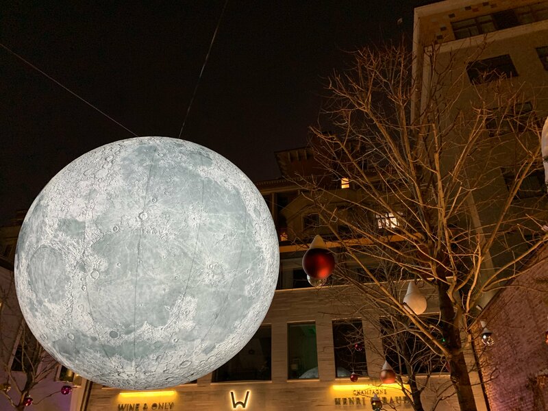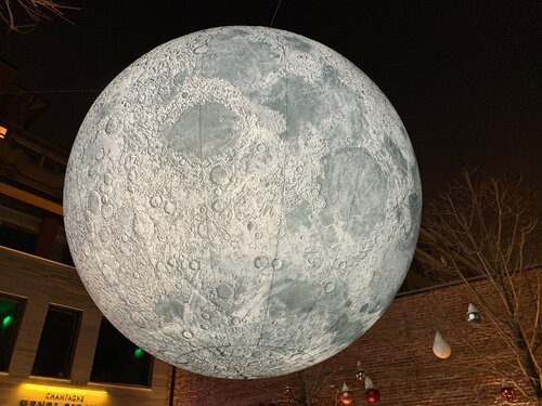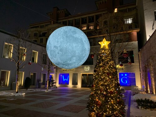 Давно хотела попасть сюда и , наконец, я дошла до луны. Полный восторг! Как красиво! Замечательная задумка и прекрасное воплощение. Луна выглядит завораживающе, так и хочется смотреть ещё и ещё, она очень реальна. Двор оформлен красиво. На ёлочке игрушки тоже на космическую тему. Кому надо сделать красивые и неординарные фото, вам сюда. Пока мы фотографировались никого не было. Налюбовались и нафотографировались вдоволь. Спасибо за прекрасную локацию.