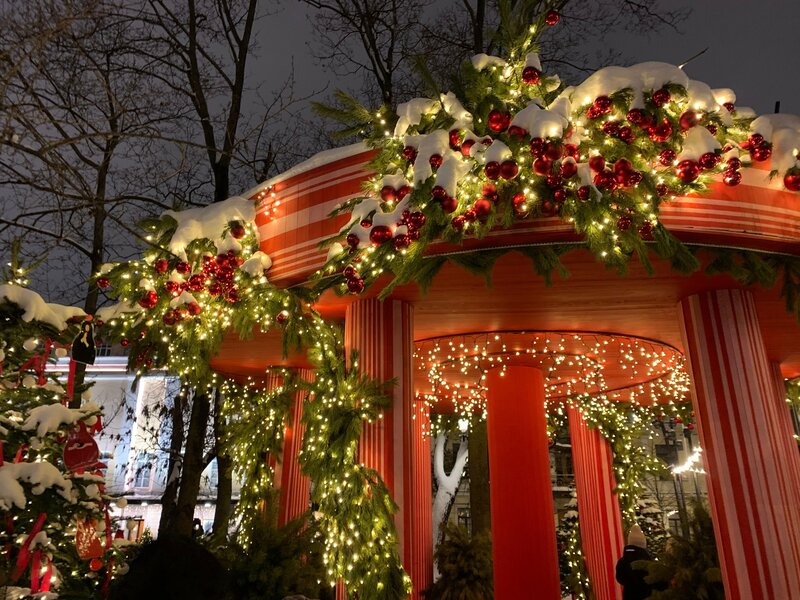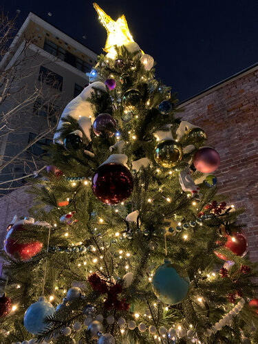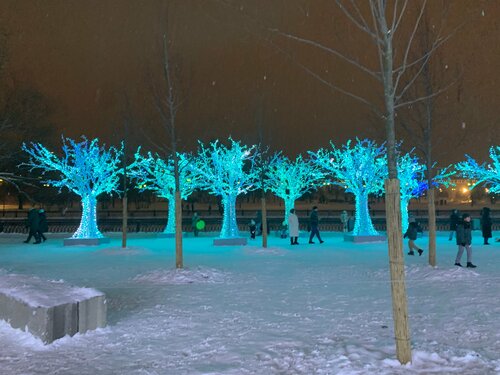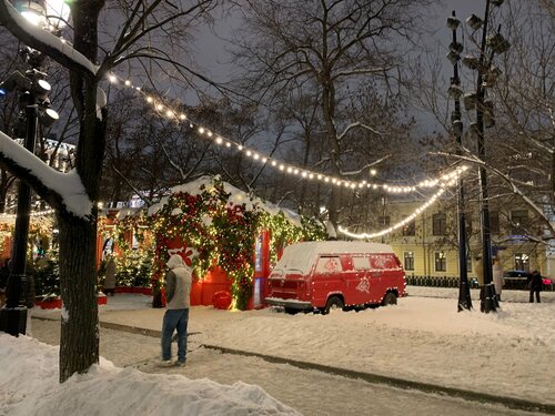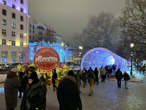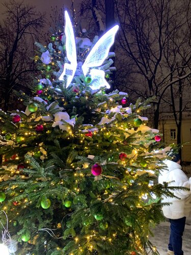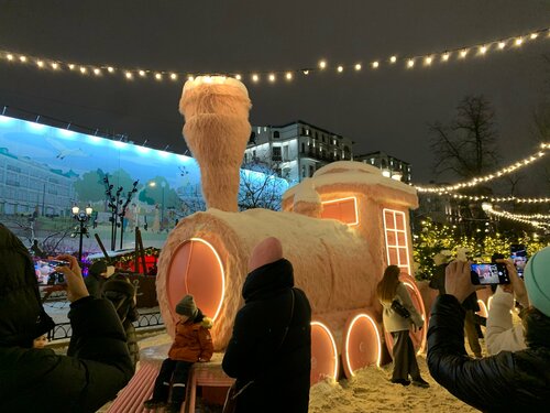 Мой любимый Тверской бульвар нарядился к праздникам. Очень много оригинально украшенных ёлок. Есть кафе и киоски. Купили вкусный глинтвейн. Есть площадки для детей. Необычный розовый паровозик. Много мест для красивых фото.