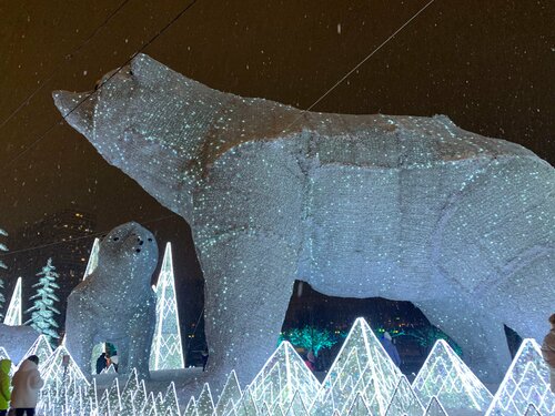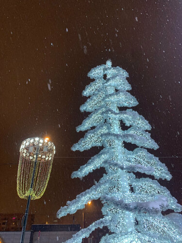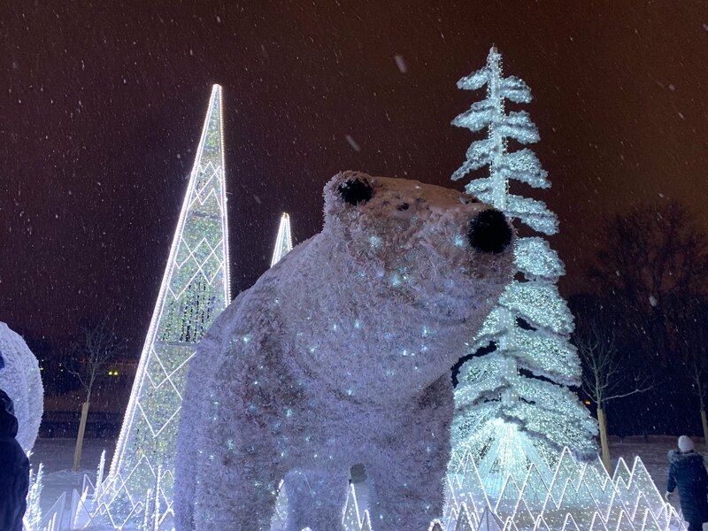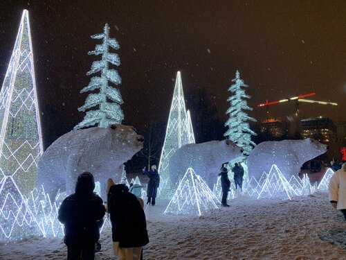 Красивейшая инсталляция Белые медведи. Дарит новогоднее настроение. Большая медведица и маленький медвежонок,и ещё несколько медведей поменьше среди льдин и елей. Всё это сияет и переливается. Конечно, смотреть на них надо вечером, чтобы налюбоваться этими огнями. Недалеко красивая ёлка и украшенные иллюминацией деревья. А над всей этой красотой на холме храм.