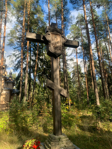 Красивый деревянный храм и территория вокруг в цветочках, есть колодец с освященной водой. И деревянный крест справа от входа с вырезанной иконой Богородицы.