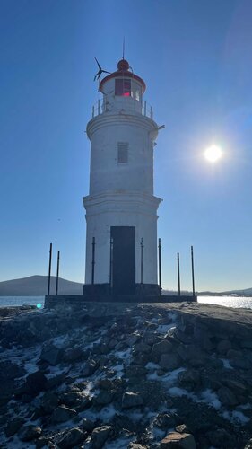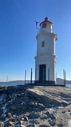 Очень красивый маяк в прекрасном месте. Можно приехать на машине, прогуляться по косе, помочить ноги, полюбоваться морем, островом Русским и самим маяком