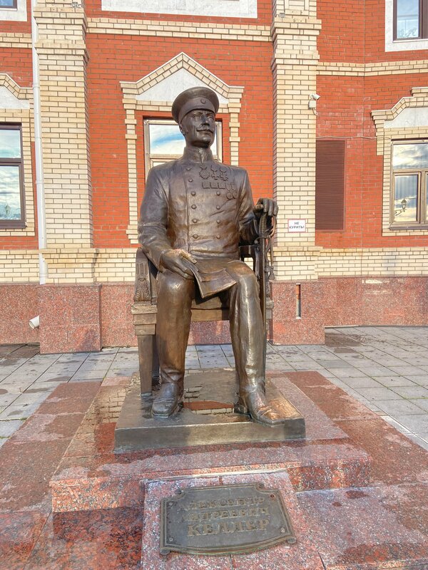Интересный памятник открыт на берегу Малой Кокшаги в Йошкар -Оле на, так называемой в народе «набережной Брюгге» Александр Андреевич Келлер, происходит из немецких дворян, как пишут некоторые сайты. Правда, неизвестно где он родился, нет даже фотографий его при жизни. Но историки и специалисты по званиям иерархии царской России пусть в этом сами разбираются. Важно, что марийцы чтут своего земляка, за то что добровольно поехал в Царевококшайск, который входил в Казанскую губернию. В общем, отправился в глубинку сам, и, видимо, сотворил выдающиеся добрые дела! Даже сейчас не многие хотят из столицы Татарстана туда ехать. На автобусе это занимает около 2-х часов. А раньше передвижение было на лошади в бричке! Но вернемся к памятнику и народному герою. Келлер А. А.- родом из немецких баронов, принявших российское подданство и православное вероисповедание. Получил домашнее образование! В 1807 г поступил на службу в российскую армию, в гусарский полк в звании унтер-офицера, через 6 лет в 1813 г получил звание корнета. Был участником Отечественной Войны с французскими захватчиками. Был ранен в обе ноги. Но это отдельная история. С 1817 года исполнял должность дивизионного адъютанта. И за «доведение до отличного устройства нижних чинов» учебного эскадрона ему было объявлено «Высочайшее Благоволение». После, в 1820 г оставил военную службу и переехал жить в Казанскую губернию. В 1830 г стал земским исправником Царевококшайского уезда. В должности окружного начальника оставался до начала 1862 года. А это суммарно более 30 лет преданной службы государю, в должности большого чиновника! На свои личные средства открыл несколько гимназий в деревнях уезда и потом их на свои средства поддерживал. Написал трактат в 1837 г « Статистическое описание Царевококшайского уезда» , что и является его главным историческим наследием. Именно этот факт, и совокупно аккуратная долгая служба, благотворительность, и послужили основными причинами увековечивания памяти. Памятник необычный, установлен на низком пьедестале, что приближает фигуру к народу, на сколько максимально возможно. И это символично, а еще позволяет прикоснуться, всем желающим, что они и делают! А туристам я желаю доброго созерцания этого шедевра, и набережной в Йошкар-Оле. Это прекрасный город!