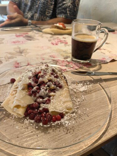 Гуляли по Патриаршему саду, проголодались. Увидели блинную и решили выпить кофе. Взяли блинчик с красной рыбой и блинчик сибирский (сгущёнка, замороженная брусника, кедровые орешки). Вкусныыые. К блинчикам взяла по привычке свой любимый кофе американо, а надо было брать чай. К блинчикам чай было бы самое то. Сама кафешка маленькая. Убранство в стиле бабушкиной избы. Но грязновато. Протереть бы столики и плёнку на них, убрать мусор из WC. Расставить салфеточки.