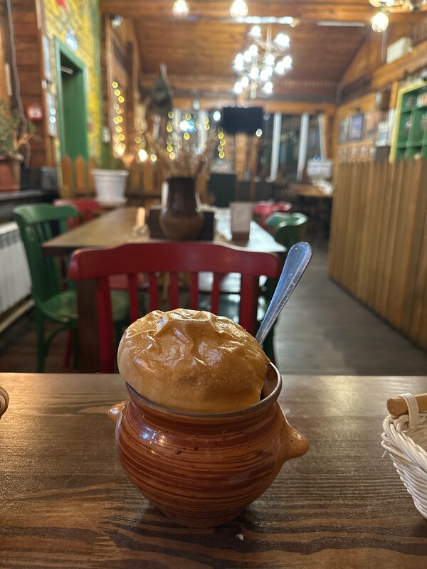 Интересный дизаин, теплая атмосфера, печка, уют…., Блины вкусные, чай хороший. Щи в горшочке вроде их фишка, но не особо вкусные, как в столовой.