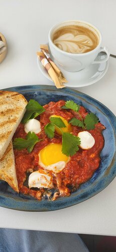 То что надо на побережье моря:бокал игристого вина и десерт) Есть большой выбор завтраков с 8.30 утра до 20.00,шикарно же. Рекомендую!