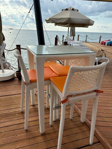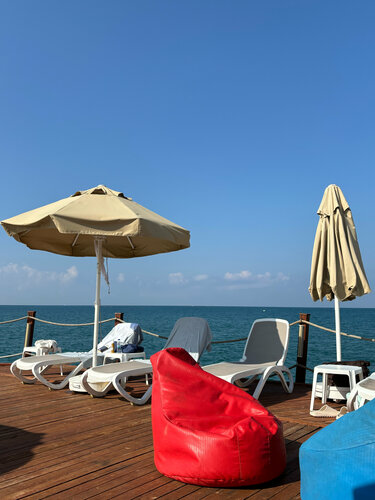 Уютный ресторан на пирсе. Быстрое обслуживание. Импортный алкоголь в ассортименте. Пиво. Столики и диванчики рядом с лежаками. Удобно! Очаровательный вид с пирса на горы и море!