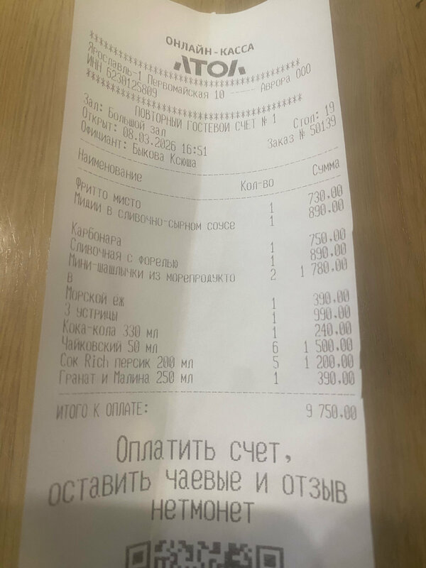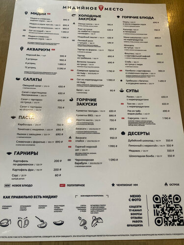 В целом норм. Меню честно не для меня, да и вообще мидии не очень люблю, на вкус как рыбьи кишки )))). Устрицы и еж, попробовали, нам не зашло, но свежее точно. Обслуживали быстро, интерьер нормальный и свежий. Для тех кто любит мидии и прочих сложных морских тварей пойдет. Паста с рыбой и карбонара норм, шашлычок тож не плохой. Можно сходить для разнообразия. Решил исправить немного отзыв и добавить)))) ели устрицы и ежа, 2 дня полет нормальный, ни кто не обделался 😂