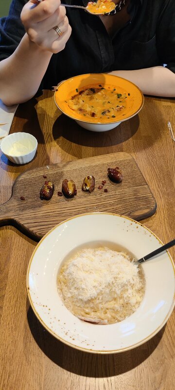 Прекрасное место для любителей хорошего сыра и вкусной пасты. Соуса в пасте - выше крыши. Он вкусный, жирный, сырный, как и надо. Суп с фасолью тоже неплох. Финики с сыром очень понравились, классное сочетание.