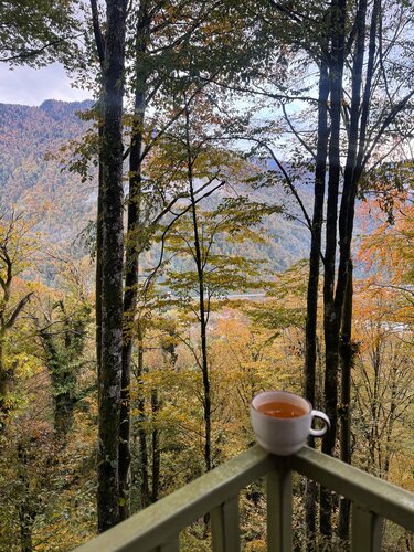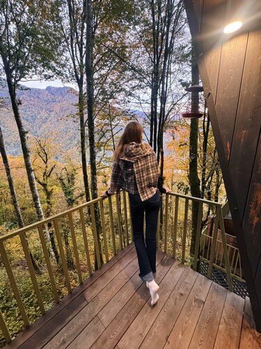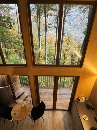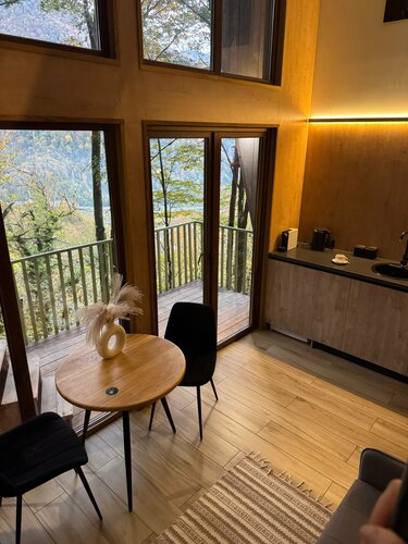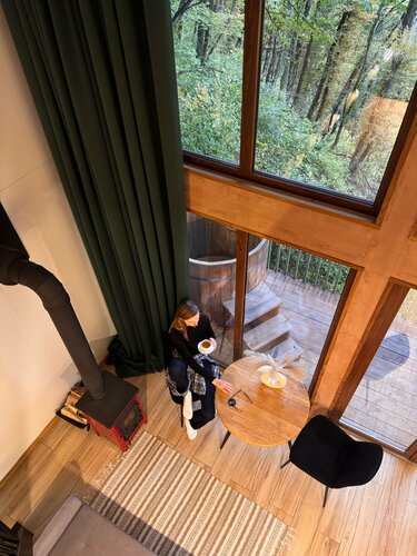 Если коротко: 5 камерных домиков среди леса, мягкий сканди-уют, вид на горы и вечера под потрескивание дров. Локация: - Поселок Красная Поляна, но в отдалении от центра - Вокруг — лес, река и горы - Атмосфера медленная: утро пахнет деревом, воздух — со свежим дыханием ледника. Номера - Двухуровневые домики с оборудованной кухней - Светлые, лаконичные, с тёплым деревом и текстилем. - Из полезного: удобные матрасы, плотные шторы , много розеток, есть стол для ноутбука. - Вид из окна — «телевизор природы» работает 24/7. - Горячая купель на террасе - Гостиная с камином/печью и мягким светом — хорошо для чтения и тихой работы. - Терраса: лучший спот для утреннего чая и вечерних разговоров, слышна река. - Дровяной уголок и пледы — мелочь, но создаёт чувство дома. Сервис - Заботаюливый: подскажут тропу, вызовут трансфер, помогут с планом дня. - Чек-ин гибкий. Для кого подойдёт - Парам, соло-путешественникам, тем, кто выгорает от суеты. - Тем, кто ценит камерные места и «мягкую» инфраструктуру вместо крупных отелей и курортов. Ресторанной жизни в шаговой доступности тоже нет. Что делать поблизости - Треки по лесным тропам и вдоль реки - Кругозор Ефремова в 20 минутах пешком - До подьемников - 20 минут на машине Стоимость суток для двоих сейчас - 11000₽