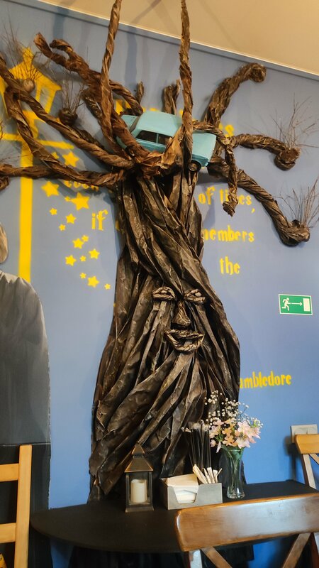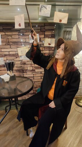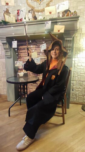 Прикольное кафе, стилизованное под Гарри Поттера. Можно попить чай с десертами, согреться и посмотреть фильм с Гарри Поттером. А так же применить шляпу, плащ и поколдовать)