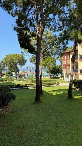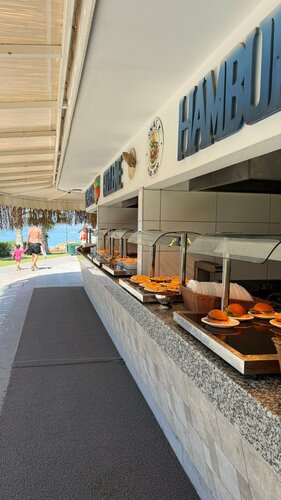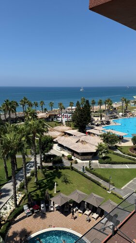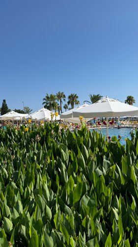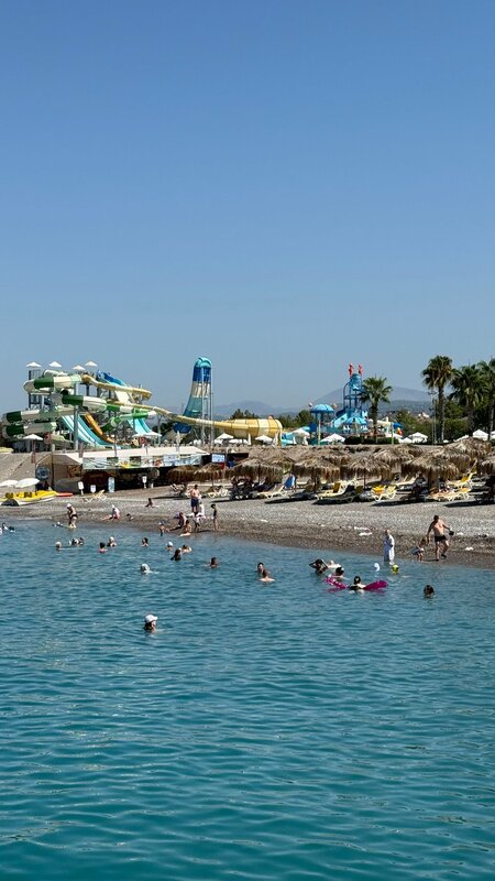 У этого отеля очень неплохо всё обстоит с морем в августе — вход пологий галечный, есть пирс с лежаками и баром, есть отдельно плавающий понтончик. Водяные горки в разных бассейнах на разный возраст — от грудничков до больших взрослых. Баров много, питание почти непрерывное, номера не крошечные.