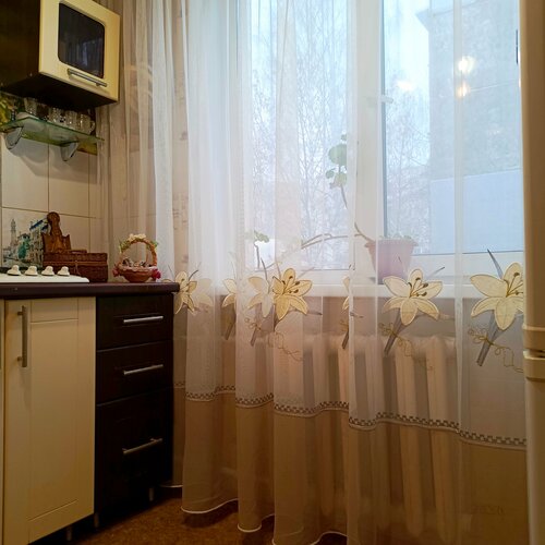 Недавно купила сетку, хочу поделиться результатом. Сетка стоила 400р за метр, взяла из-за внешнего вида и цены. Шить из нее не очень удобно, пришлось помучиться, но оно того стоит. Лилии смотрятся изумительно, кухня стала более уютной.
