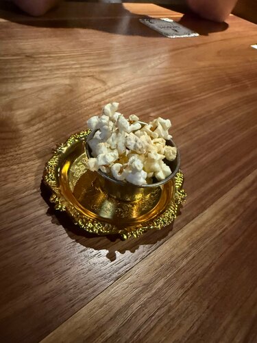 Мне очень понравилось обслуживание. Официантка прям подстроилась под наши приколы) интерьер хороший. Туалеты чистые. Ценник не очень высокий. Насмешил комплимент от шеф-повара в виде рюмки поп-корна🤣 одному то мало🤣