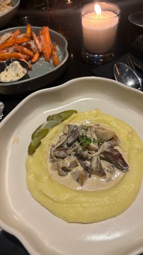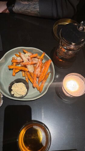 Томный лаунж с красивой игрой света и приятным интерьером. Есть гардероб, официант был очень вежлив, пересадил за столик побольше, видя дефицит места на столе. Травяной чай — просто лучший. Севиче из лосося и тартар из говядины свежие, вкусные, мясо и рыба на пятерочку. Разве что картофель-пай к тартару не в тему — слишком его много. Хумус разочаровал — попался твердый нут, можно и зуб сломать. Сказала об этом, как будто реакции ноль. Не хочется за это снимать балл, но хотелось бы больше внимательности.