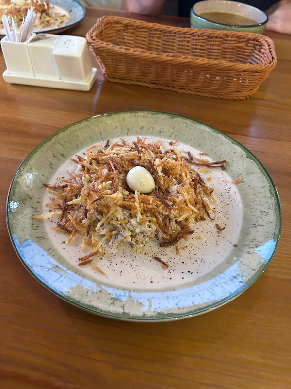 Визуально очень красивое и интересное место. Друзья, которые уже тут были сказали, что очень вкусно и недорого, а еще сделан ремонт. Заехали специально посмотреть и попробовать по пути домой с Крыма в Вологду. Очень вкусно, все кто проезжает мимо, обязательно остановитесь тут. Я лично взяла салат Гнездо глухаря - просто отвал, как вкусно. Муж взял куриный суп, ему он тоже очень понравился.