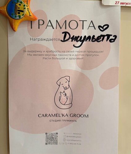 Шикарный сервис! Записались онлайн, администратор связалась после этого, рассказала про процедуры, уточнила все нюансы, в случаях форс-мажора администратор так же оперативно предложила варианты решения. Отдельное спасибо грумеру Алине, нашла подход к нашей булочке, и главное она осталась в восторге! Очень внимательные сотрудники, большое спасибо! А эта грамота, просто в самое сердце!💔