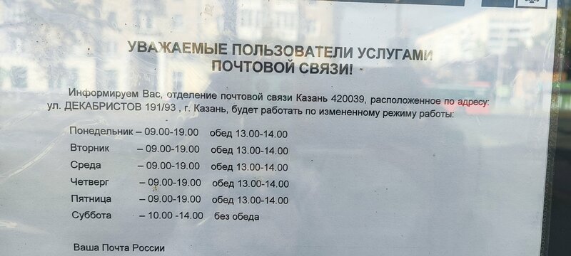 Пришла смс на получение посылки. Смотрю карты, график работы 8.00-20.00. Прихожу в 13.24, выясняется, что изменили время работы и поставили обед 13-14. С какого числа? Навсегда? Или как? И почему не внесли изменения в график работы на картах???!!! И о каком уважении к клиентам может идти речь??
