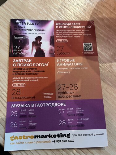 Гастродвор -пространство между домами соединяющее две улицы проспект Столыпина (бывший проспект Кирова ) и улицу Дзержинского , умело сделав крышу и собрав сообщество ресторанчиков на любой вкус и цвет с разными категориями вкуса и разным меню .Приходишь находишь свободный рандомный стол сканируешь номер стола выходит меню всех ресторанов выбираешь покушать ,выбор огромен ,от шашлыка ,морепродуктов ,десертов ,паст пицц и т д и напитков алкогольных и безалкогольных . Затем оплачиваешь при заказе за каждую позицию по факту . Удобно ! Уютно ! Весело ! 🔥🔥🔥🔥🔥 Часто проводят мероприятия завтраки , беседы с психологом ,разные активности для взрослых и детей ,на сайте программа на неделю прописывается . Можно посидеть поработать , встретился с друзьями, позавтракать в обед , послушать выступление вечером , на втором этаже кальянная , Вае очень душевно ❤️добавить нечего …все нравится👍 рекомендую 🔥