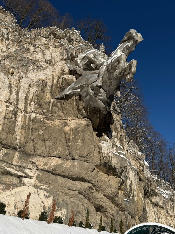 Очень красивое место! Необычный памятник -всадник, появляющийся из горы. Рядом озеро с пахучим сероводородом. Есть небольшая парковка. Есть особое место поклонения, куда могут пройти только мужчины.