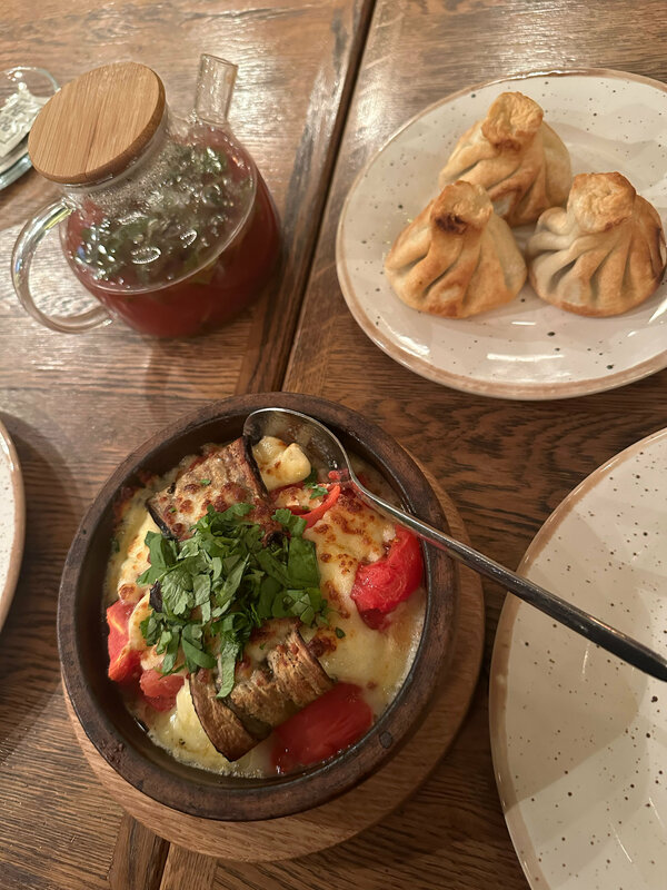 Советую салат с теплыми баклажанами Люляшки Брали также красное и белое сухое вино. Белое было совсем легким. Хинкали с бараниной и зеленью Обслуживание хорошее Фоном играет грузинская музыка