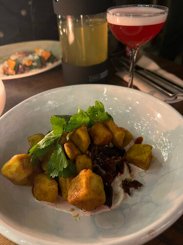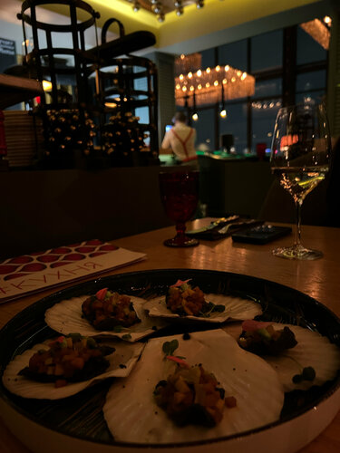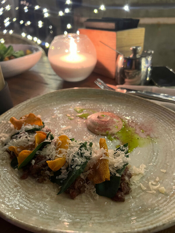 Салат с баклажанами и страчателлой (соус был очень кислым, даже во рту сводило всё, доесть не получилось, соотношение сыра и остальных ингридиентов не очень, хотелось бы больше сыра-будет лучше), так же свёкла какая-то не вяленая, а как будто просто недоварёная) - баклажан топ. Копчёное филе сибаса - очень вкусно, но немного пересолили. Тартар из говядины отличный! Огромную благодарность хотела бы выразить официанту Владиславу - за его профессионализм и внимательность. Во время убирал грязные тарелки, принёс плед, когда понял что я начала замерзать (на веранде), рекомендации тоже оказались к месту! 5 звёзд ставлю только благодаря официанту. Полы на веранде не очень крепкие. Когда по ним ходят, трясётся стол и ты, сидящий в кресле, казалось вот вот вилка выпадет из руки 😂 В целом, место хорошее, рекомендую. Была не в первый раз, но отзыв оставляю впервые. Приду ещё.