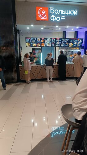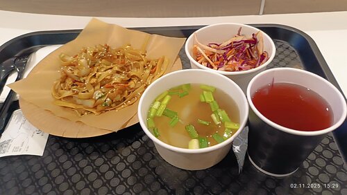 Брала один из вариантов ланча, который здесь действует и в выходной день в отличии от точек рядом. Вкусная лапша, салат жестковат, но вкусная заправка, морс и суп тоже понравились. Не смотря на загруженность готовят достаточно быстро. Чисто. Посадочных мест много, но в пиковые часы придется поискать свободное.
