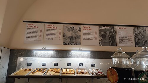 Отличная пирожковая прямо напротив Спаса на Крови. Атмосфера тех самых советских пирожковых и это отражается даже в мелочах - музыка, столики с высокими стульями, головные уборы продавщиц, напитки в тех самых конусах. Пирожки выпечные и жаренные с самой разнообразной начинкой (некоторые варианты увидела впервые), классический кофе с молоком, бульон. Чисто, уютно. Мест достаточно. Приветливые сотрудники. Обязательно будем сюда заходить.